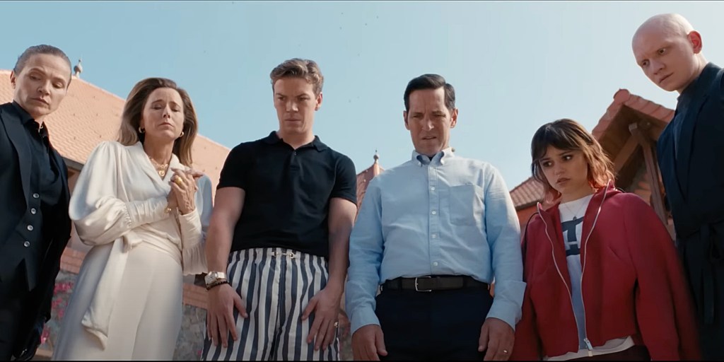 Death of A Unicorn focuses on the father-daughter dynamic of Elliot and Ridley, played respectively by Paul Rudd and Jenna Ortega as they navigate a weekend retreat at the mountain mega-lodge of the billionaire Leopold family whose pharmaceutical empire has keyed in on Elliot as a potential proxy for the family office. After a delay at the airport leaves Elliot rushing to meet his benefactors, his distracted driving literally rams into the film’s propelling story, hitting a unicorn and causing the titular death or so we think. Dumbfounded as they are to discover the mythical creature, they manage to bundle the roadkill into the trunk of the car to minimize any further delay.